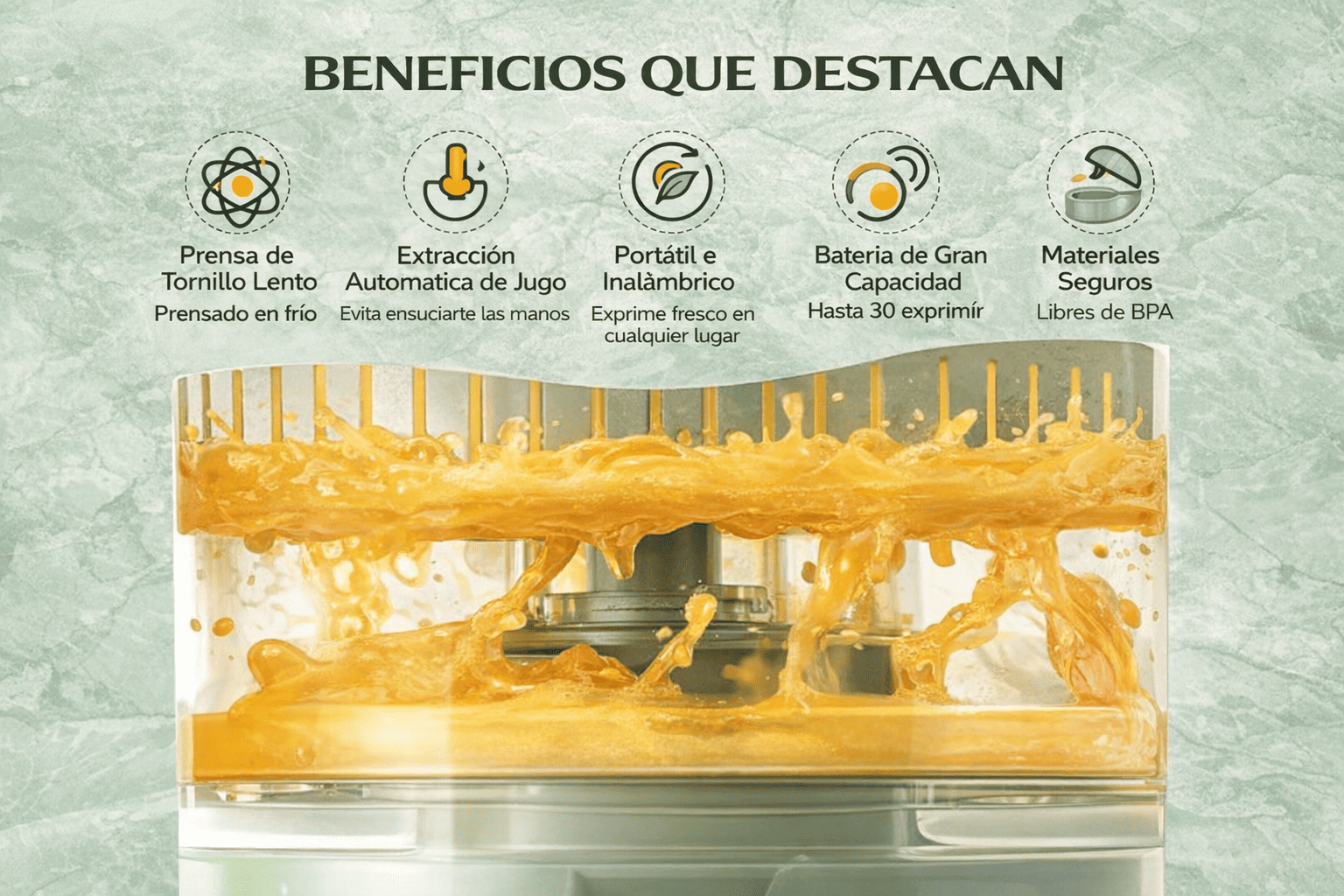 ¿Pierdes tiempo exprimiendo a mano y no obtienes suficiente jugo? Con el Exprimidor Portátil de Naranja Pro disfruta jugo 100% natural en solo 30 segundos, sin esfuerzo y sin ensuciar.